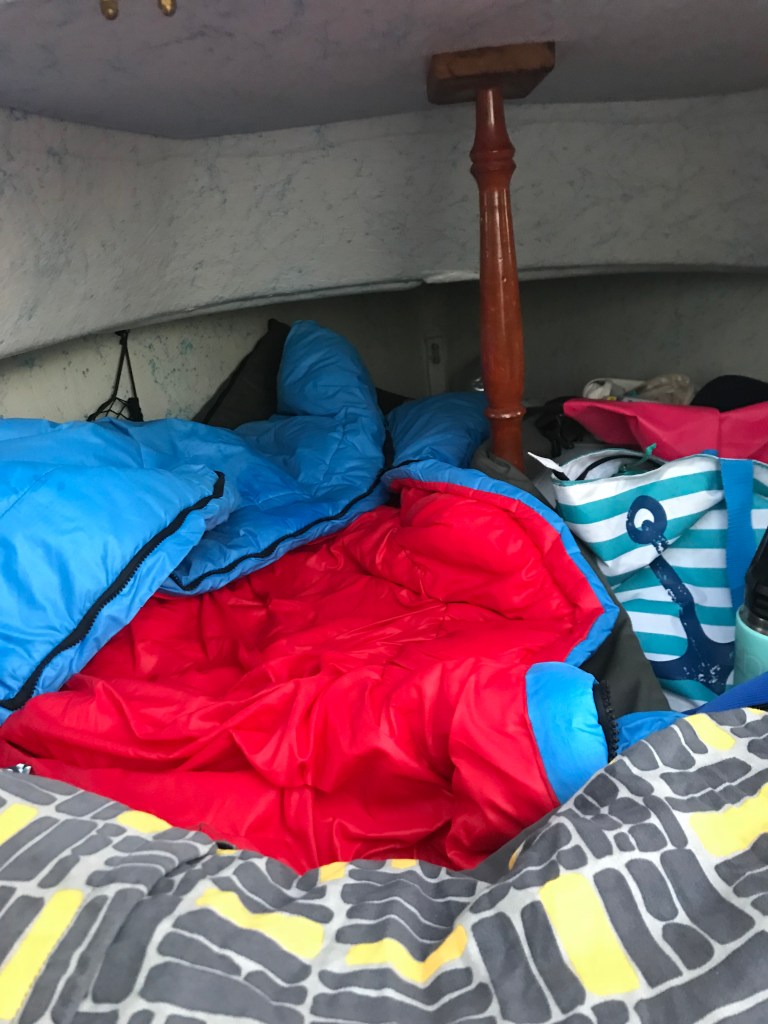 For such a small boat, my little 13 foot claimed that a 6’ 8” person could stretch out in her cabin. This may be true, but it was snug fit for me (5” 7”).  I prepped her cabin for sleep. It was chilly and temperatures were to drop into the 40’s. I bundled up, closed the hatch, read a little, and listened to the stillness. I slept decent for my first night alone on Guppy.