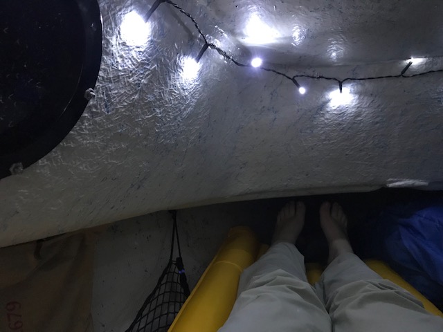 After a lovely evening with great people, food, and a rich hot chocolate, it was bedtime. I climbed back down onto Guppy, set up her cockpit tent and then transformed her cabin for the night. I inflated my air mattress, unrolled my sleeping bag, and changed into my cozy pajamas. I wiggled into the sleeping bag and relaxed, completely wiped out from the very full day. Ahhh, so nice to close my eyes, I thought, as I stretched out. And then I felt a huge wave lift Guppy up and slam her down. My eyes popped open, What the heck was that?!