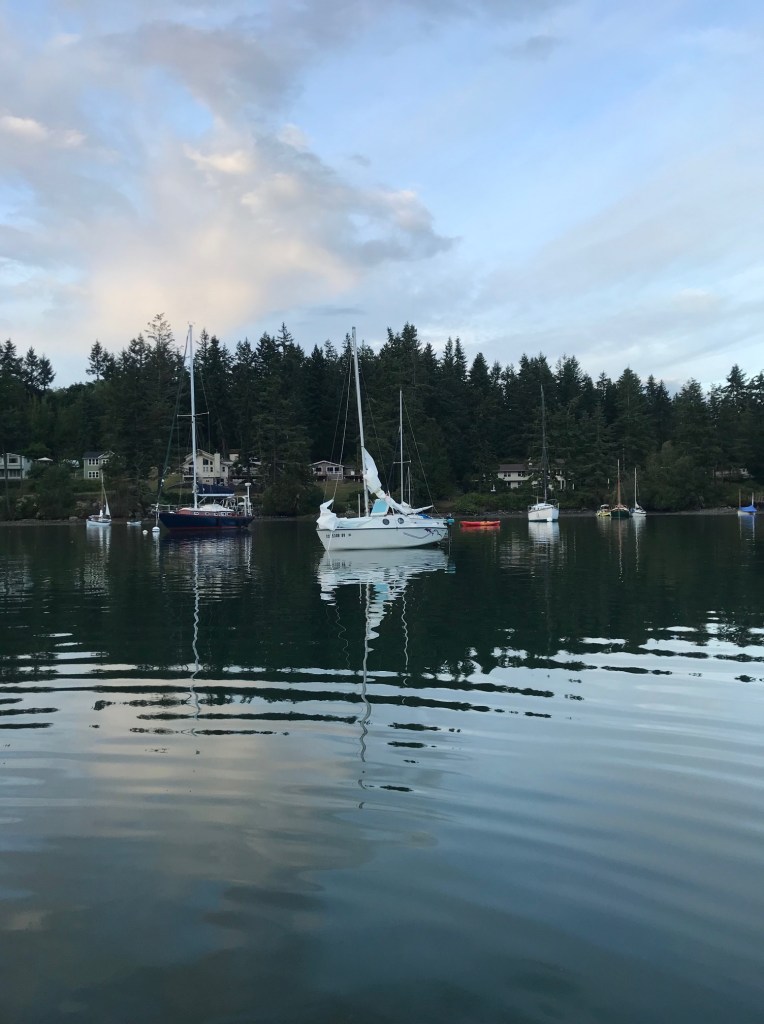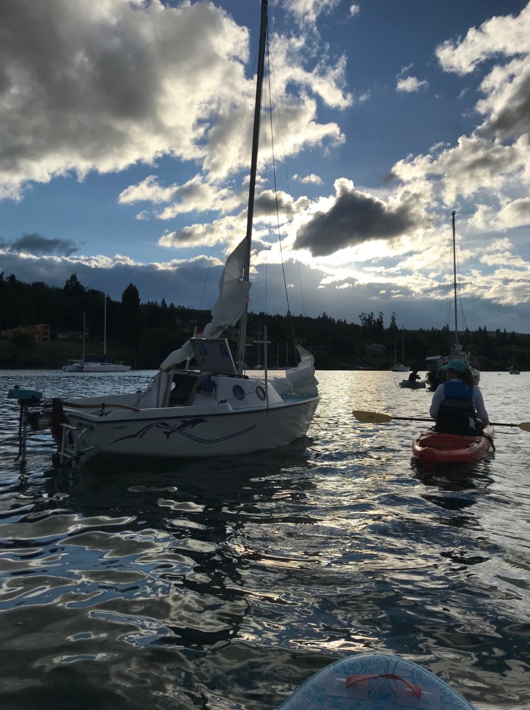 As I passed the point and turned starboard into Henderson Inlet, the winds started picking up. I gained speed and had to tack up the inlet to the designated anchorage. It was a blast. I had little races with nearby boats and even beat a Montgomery 15. Then a Catamaran came zipping by playfully, super speedy passing us easily, splashing and having fun. I approached our anchorage and searched for Christine and her group. The Lewis-Clark Sailing Association from Idaho were a jolly and welcoming group of sailors. They greeted me with Gin and snacks, as I rafted along side Christine. Once safely rafted, Christine climbed aboard Guppy and created the jib downhaul by attaching a block to the tack of the jib sail and ran a line from the head of the sail through the block and back to my cockpit. This would allow me to lower my jib sail safely from the cockpit and not require me to physically get on the bow. I appreciated her help and it came in extremely useful the following day. I decided to set up my cockpit tent as well as inflate my tender, the inflatable paddle board that would aid me in getting to and from shore and around anchorages. It was a beautiful sunset with a great group of people. We drank, ate and shared stories. It was a fine first evening followed by a very restful sleep in Guppy.