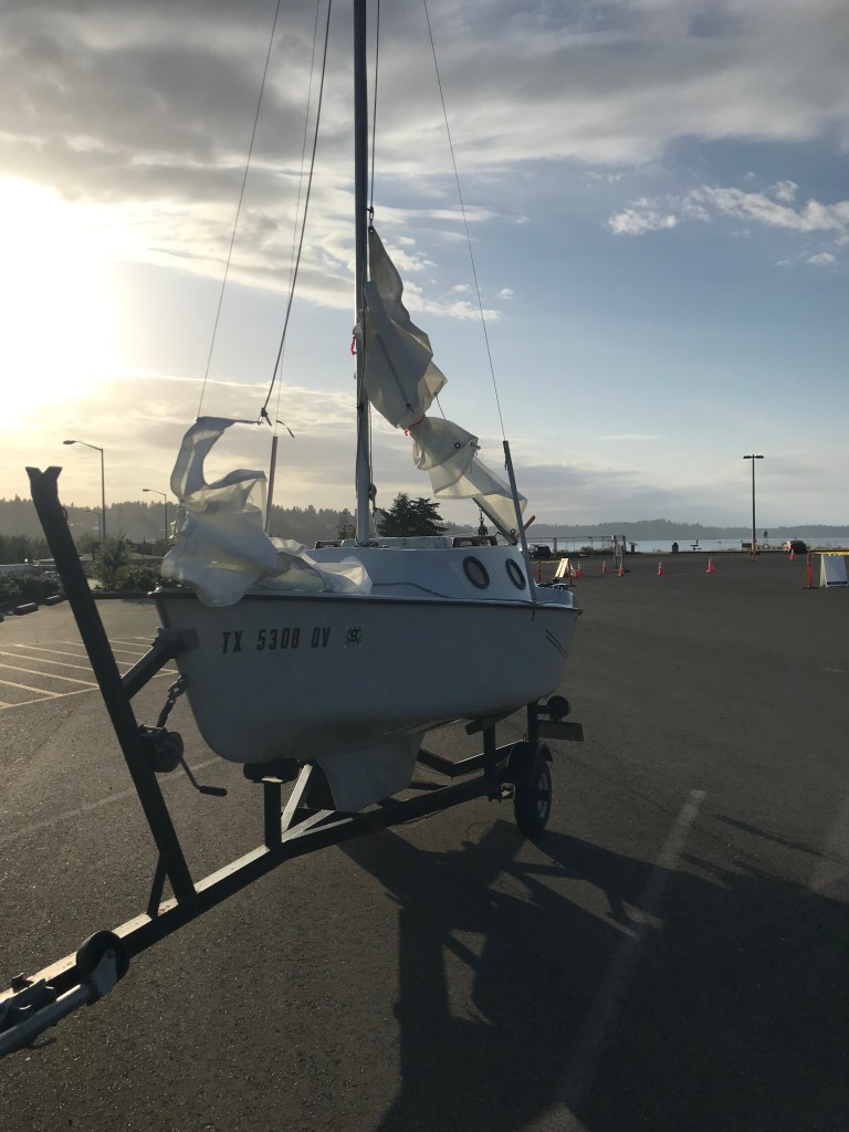 It was June 22, 2019, and the official first day of the inaugural Salish 100 event. I was brimming with excitement. Mom and I packed up early that morning and decided to get a coffee before the scheduled skipper’s meeting. But before the coffee run, I needed to teach Mom how to attach and detach Guppy’s empty trailer since she would be traveling independently with my car, while I was out sailing. I demonstrated how it was done, and then she attached it. It looked good to me, and she noted how it was easier to lock than she had expected. I didn’t think much of that notation, and we went on our way. After 2 minutes of slowly driving along, the most awful sound came from the back of the car. The trailer had come off the ball hitch! It was flopping about, making lots of scary noise by hitting the car’s bumper. The safety chain did its job and kept the trailer attached to the car. I pulled over immediately. Both mom and I were startled but despite all the ruckus, it appeared that no major damage had occurred to the car or trailer. Whew, what a relief. We then secured and locked the trailer properly this time and continued with our morning. I was a little shaken up and tried to avoid thinking of this occurrence as a bad omen by focusing on the positive: I now know the safety chain works.