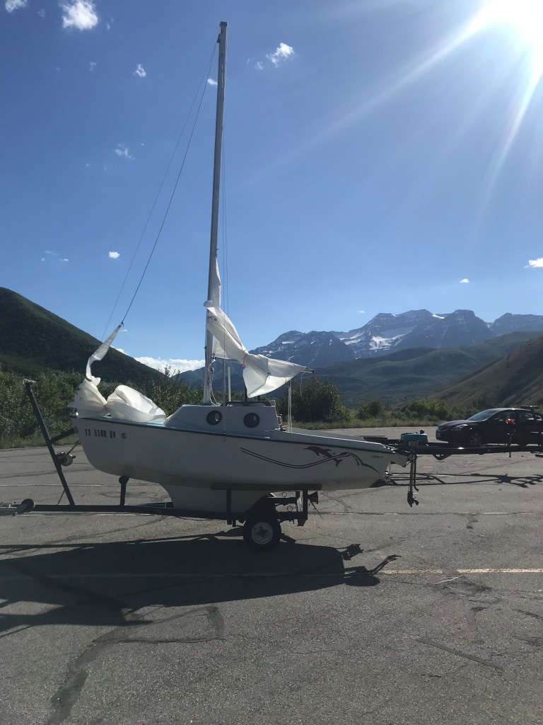 The morning was so beautiful, and also surprisingly cold. It was 42 degrees and this Texas girl was in shock. After breakfast, I said goodbye to my lovely tiny home and hit the road again. We set out for a dreamy lake in Utah that I found online to hopefully get a little sailing in. It was called Deer Creek Reservoir, and I had planned for this drive day to be only 6 hours to hopefully spend more of the daytime sailing. I was in awe as I arrived to Deer Creek, which is just outside of Provo, Utah. This clear, dark blue lake looked like a sapphire jewel surrounded by green and snow capped mountains. I thought for a bit that I may be in Switzerland. My campsite had a view of the lake and the winds were a nice 10-15 mph with the occasional gust. I took a rest and a snack and then drove to the boat ramp with Guppy. It was just too beautiful not to take Guppy out. I was lucky to have energy. I took my time setting Guppy up and paid close attention to all details. The wind gusts were catching my attention and raising a few nervous butterflies, but we were not going to miss the opportunity to get out on this gorgeous lake.