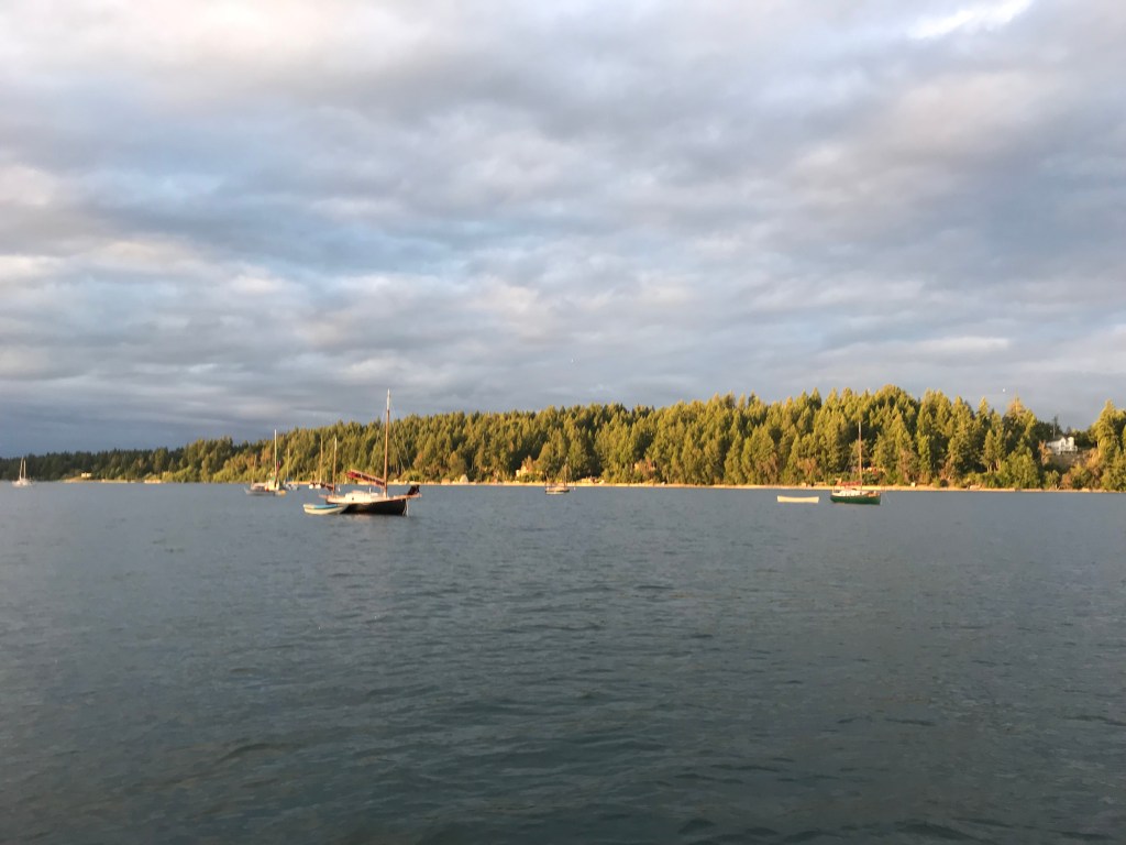 After being the last boat of the fleet to get through Pitt passage, I turned port in the direction of our next anchorage. Afternoon clouds were rolling in and the winds began to pick up. Before long, Guppy and I were flying! It was exhilarating after a slow morning of drifting. However, as we continued on, there was a little too much excitement with gusts knocking Guppy around and catching my nerves. The boat became more difficult to handle, and I wanted to reduce sail. I had my large genoa headsail up but changing it was not an option in these conditions. I decided to drop my small mainsail to reduce speed and steady the boat. The winds kept building, but I was on a nice beam reach with the headsail so I wasn’t overly concerned…. until that is, I had to go upwind to the anchorage. Everything changed at that point. The strong head wind combined with the only sail I had up, the large genoa, was a recipe for an upwind challenge. I had a very friendly support boat nearby who saw me struggling. “Want a tow?” he called out. “No thanks!” I answered back. I really wanted to prove to myself that I could do this. He suggested that I raise my jib halyard more to reduce the slack and to have more tension in the front to help me point better. He also suggested shorter tacks, to spend no longer than 3 minutes on each heading. I knew he was right about the sail and had been ignoring the issue for a while. I pointed into the wind and moved quickly to raise the jib sail as much as possible. It had been improved but still slipped a little. I had been doing long tacks because every time I tacked I would lose speed and headway, but he was right, and the shorter tacks produced clear upwind progress. I noticed a small dory in the distance who also was having some trouble going upwind, and he was now receiving a tow. It was nice to know that I had support nearby. I was definitely tiring. It had probably been 2 full hours of struggling, but I was finally nearing the anchorage.
